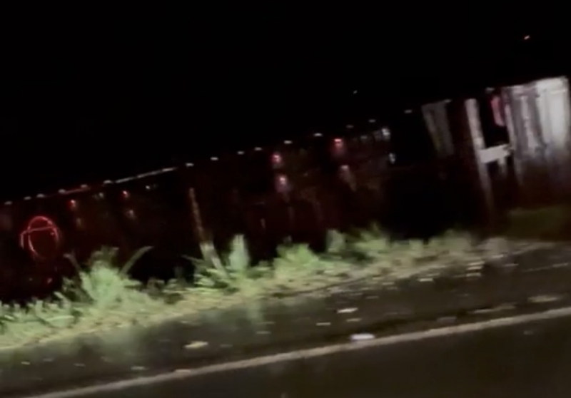 A carreta tombada permanece no local aguardando retirada.