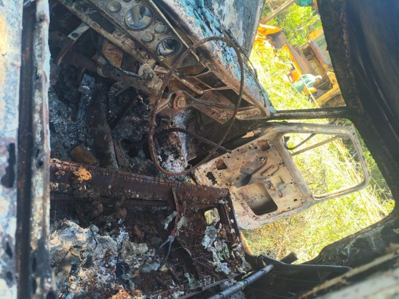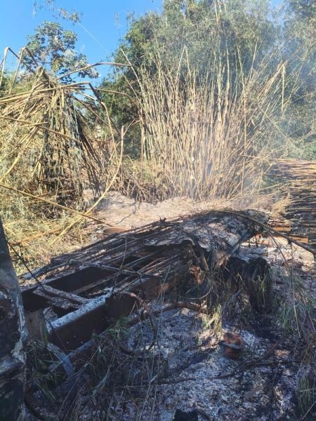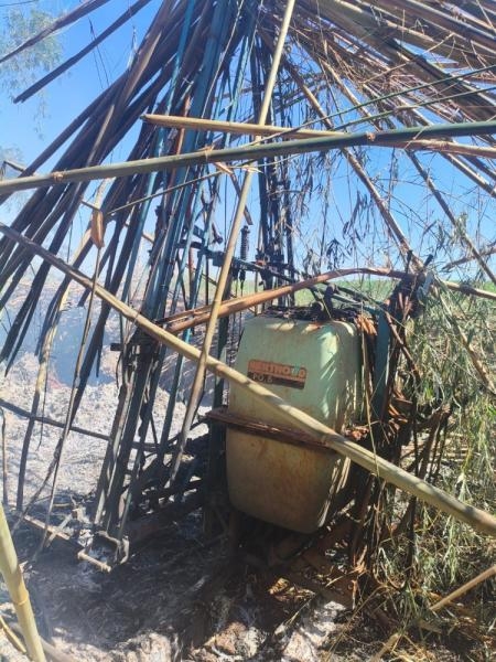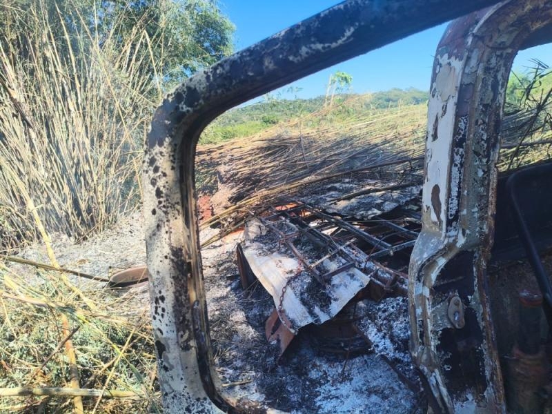 As chamas tomaram grandes proporções e destruíram por completo o veículo. O fogo também atingiu um bambuzal e um pulverizador agrícola, que também ficou parcialmente destruído.