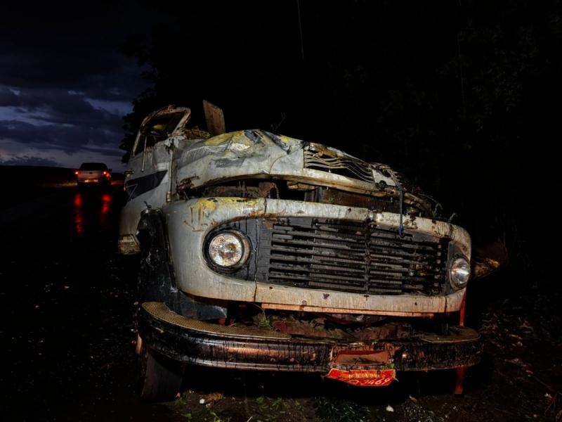 Com a pista molhada, o veículo acabou saindo da rodovia. Ao tentar retornar para a pista, o motorista perdeu o controle da direção e o caminhão acabou tombando do outro lado da margem da rodovia, ficando com as quatro rodas para cima. A cabine ficou praticamente destruída com a força do impacto.