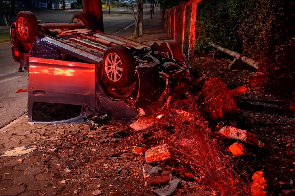 Na sequência, o automóvel subiu na calçada, colidiu contra uma placa de sinalização, atingiu a cerca de arame de uma propriedade particular e acabou capotando. O carro ficou com as rodas para cima sobre a calçada, parando a poucos metros de um poste de energia elétrica.