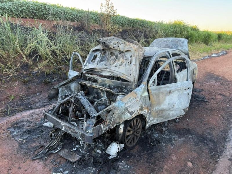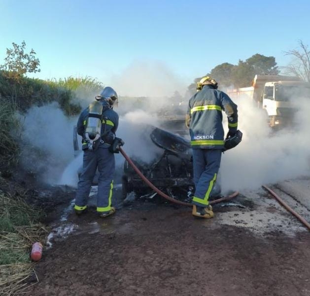 O incêndio teve início na região do capô e rapidamente tomou conta do automóvel Toyota Etios, que acabou completamente destruído pelas chamas.