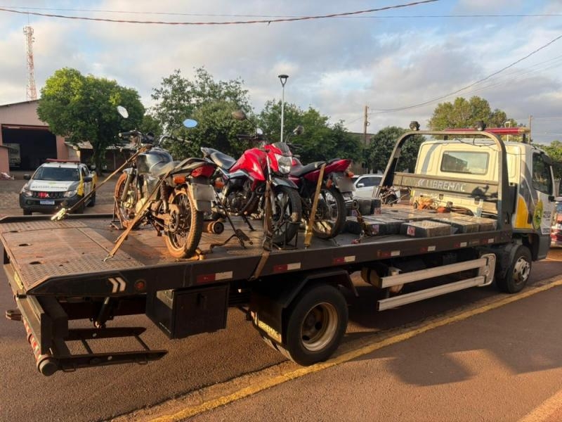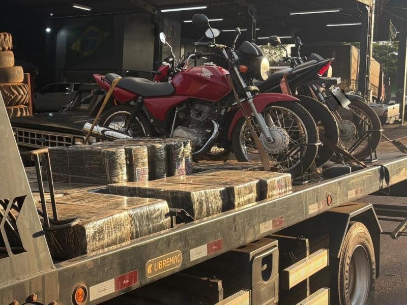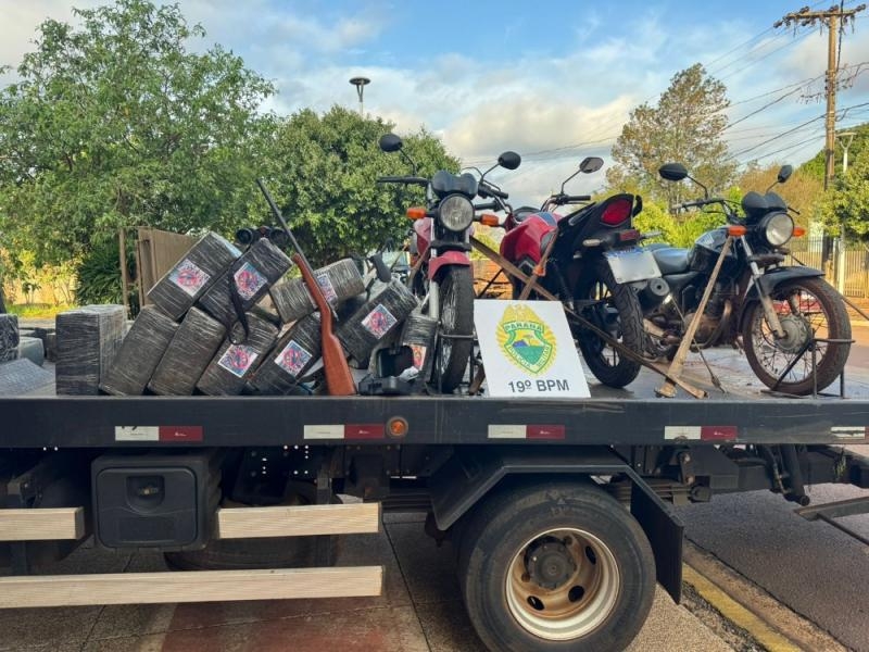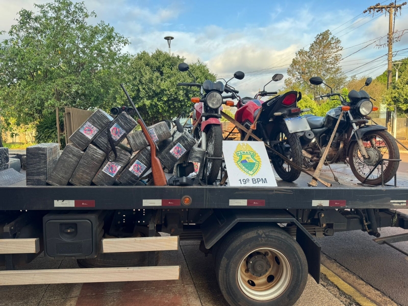 Ao todo, foram recuperadas três motos – todas furtadas em Toledo nos últimos dias – e apreendidos 557 kg de maconha e uma arma de fogo, com munições, além de um drone, celulares e um binóculos.