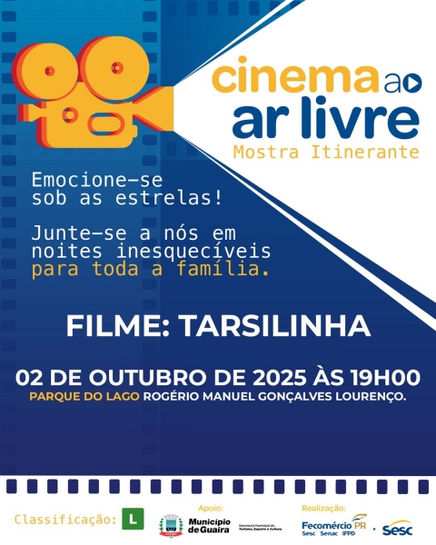 O Município de Guaíra, por meio da Diretoria de Cultura da SEMTEC – Secretaria Municipal de Turismo, Esporte e Cultura, anuncia a realização do Cinema ao Ar Livre – Mostra Itinerante, no dia 03 de outubro de 2025, às 19h, no Parque do Lago Rogério Manuel Gonçalves Lourenço.