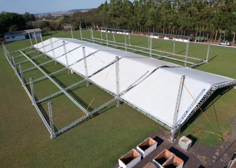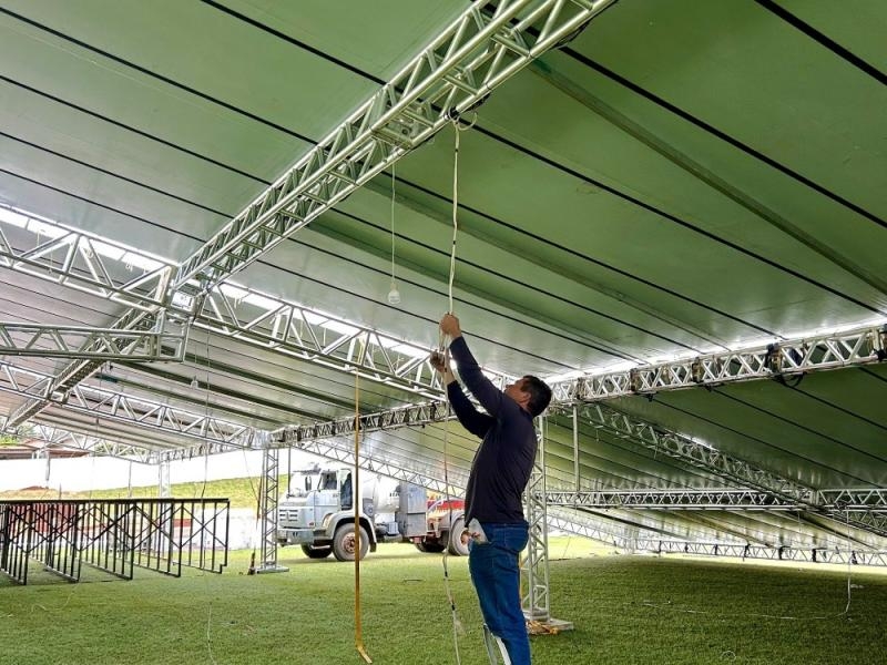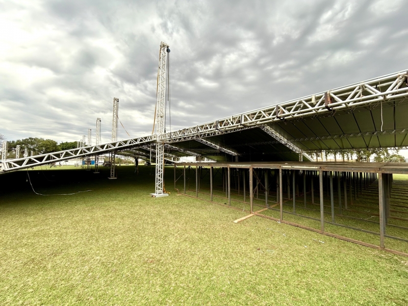 Os trabalhos desta semana estão concentrados na montagem do pavilhão central, espaço que vai receber os shows nacionais gratuitos e a tradicional Festa Nacional do Costelão Recheado.