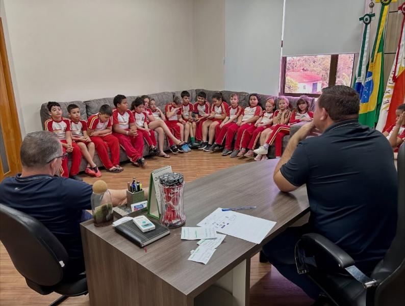 Alunos do 4º ano da Escola José de Alencar, de Três Irmãs, visitaram na manhã desta quarta-feira (15) o Gabinete do Prefeito Laerton Weber. A atividade integra o projeto “Conhecendo o Município”, que busca aproximar os estudantes da administração pública e mostrar, de forma prática, como funciona a Prefeitura.