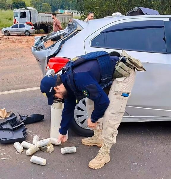 Uma jovem de 20 anos foi presa na manhã de ontem, quarta-feira (29), após uma perseguição policial terminar em acidente na BR-163, próximo ao quilômetro 27, em Mundo Novo. No veículo em que ela estava, a Polícia Rodoviária Federal (PRF) apreendeu mais de 42 quilos de entorpecentes.