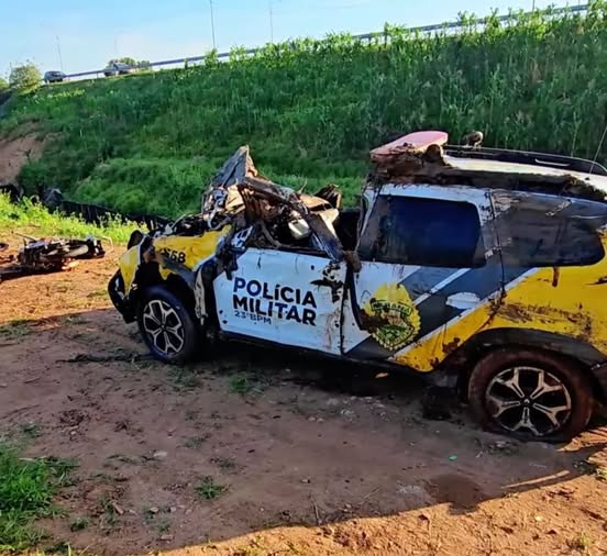 Durante o trajeto, em um trecho com baixa visibilidade por causa da escuridão, o motociclista e a viatura não conseguiram fazer uma curva, seguiram reto e caíram em uma ribanceira.