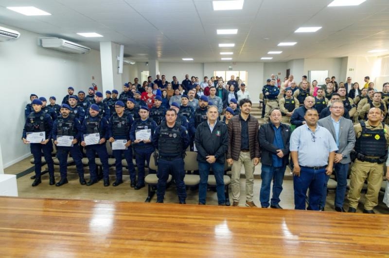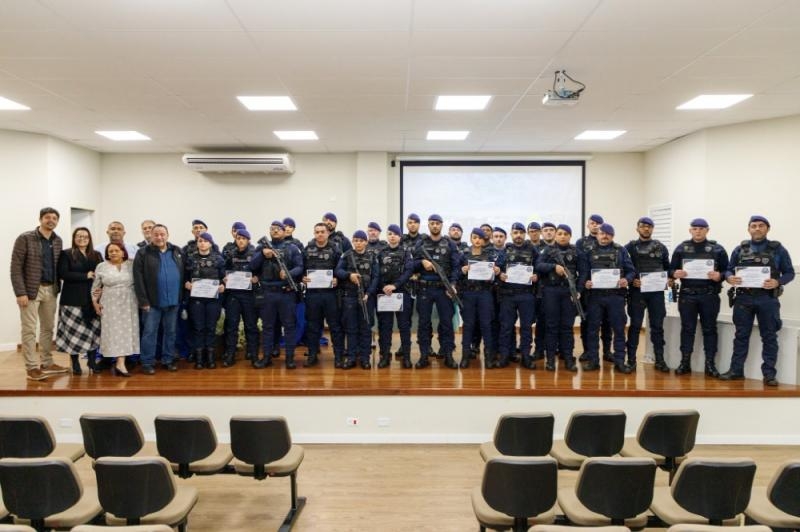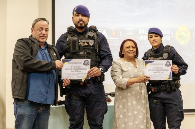Mais do que entregar armamentos, o Município também celebrou a qualificação de seus profissionais. Ao todo, 43 agentes passaram por capacitação técnica específica, conduzida em parceria com o Centro de Ensino da Guarda Municipal de Arapongas e orientada pelas diretrizes da Polícia Federal, conforme a Portaria nº 9-CGCSP/DIREX/PF/DF. Esse processo garantiu que o uso do novo equipamento seja feito com preparo, responsabilidade e eficiência. Em nome de toda a corporação, os guardas municipais Henrique da Silva e Lauana de Lima Tosti receberam seus certificados das mãos do deputado estadual e líder da Assembleia Legislativa Hussein Bakri e da presidente da Câmara, vereadora Tereza Camilo dos Santos, em um gesto de reconhecimento ao comprometimento e à dedicação da tropa.