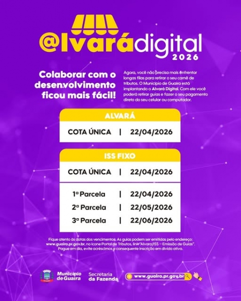 O Município de Guaíra, por meio da Diretoria de Tributação da Secretaria de Fazenda, informa que já estão disponíveis para emissão e pagamento os boletos do ALVARA e ISS-FIXO de 2026. Com vencimento previsto para o dia 22 de abril de 2026, o documento é essencial para a regularidade tributária e o funcionamento legal de empresas e profissionais autônomos no município.
