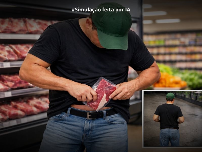 Por volta das 19h40, a Polícia Militar foi acionada via Copom para atender a ocorrência. No local, o gerente do estabelecimento relatou que, por meio do sistema de videomonitoramento, foi possível identificar um indivíduo furtando uma peça de picanha, avaliada em aproximadamente R$ 100.