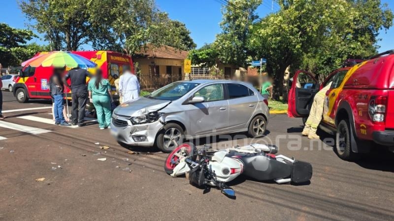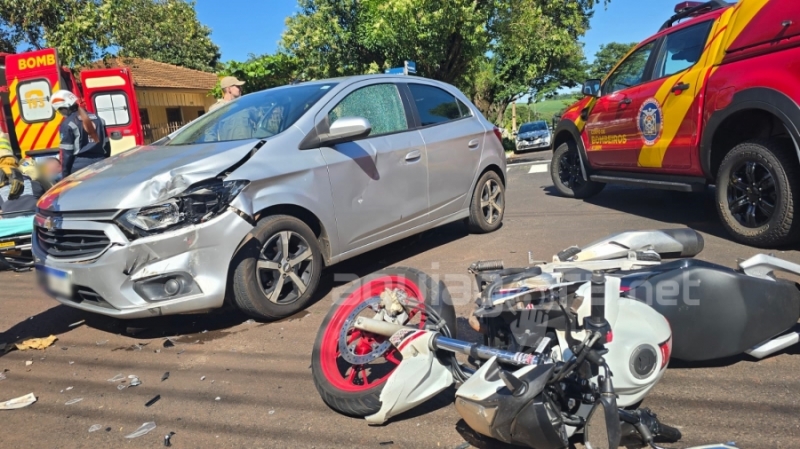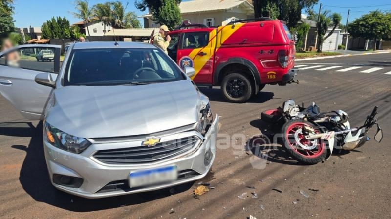 A colisão envolveu um veículo Chevrolet Onix e uma motocicleta Honda CB 250 Twister.