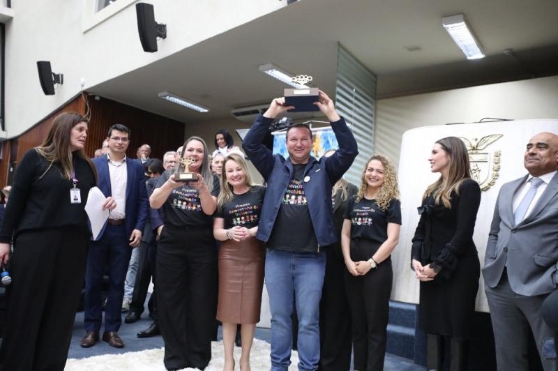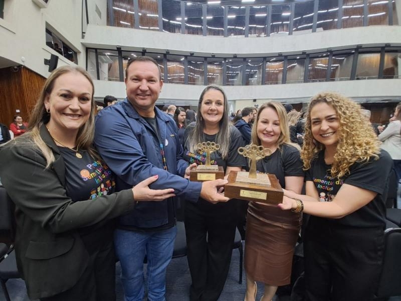 O prefeito recebeu o prêmio acompanhado da primeira-dama Lizandra Weber, da secretária de Educação Juciane Brum, da psicóloga Thalita Delabio e da coordenadora Diana Zanelato, servidoras responsáveis pela concepção e execução do projeto.