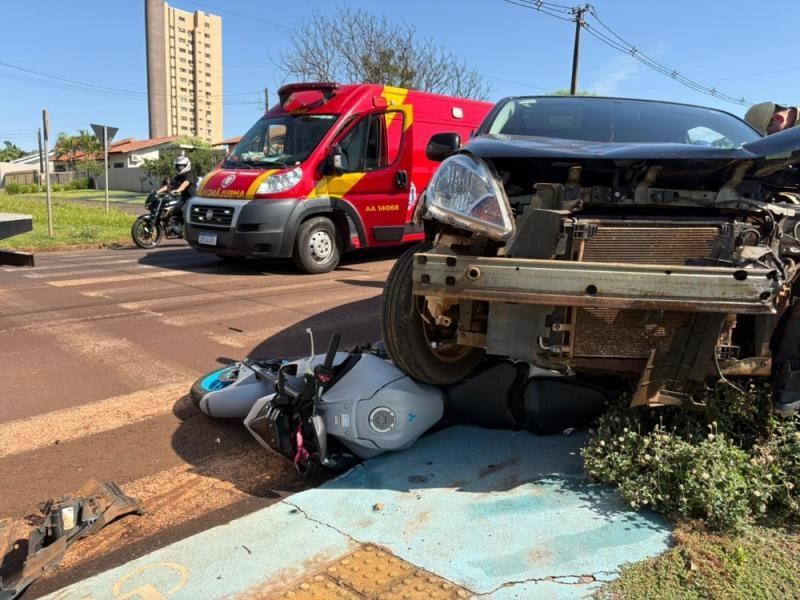 Uma forte colisão deixou um motociclista ferido na manhã deste sábado (07), no centro de Marechal Rondon. A moto ficou presa embaixo do veículo após a batida, que ocorreu próximo à Rodoviária.