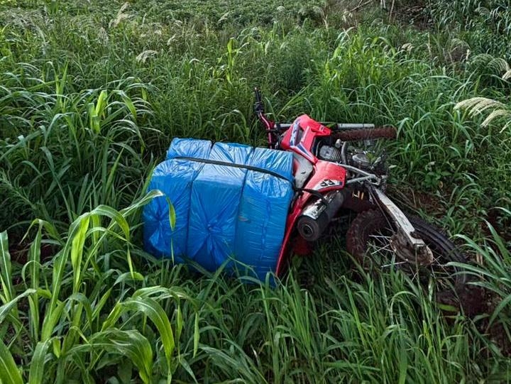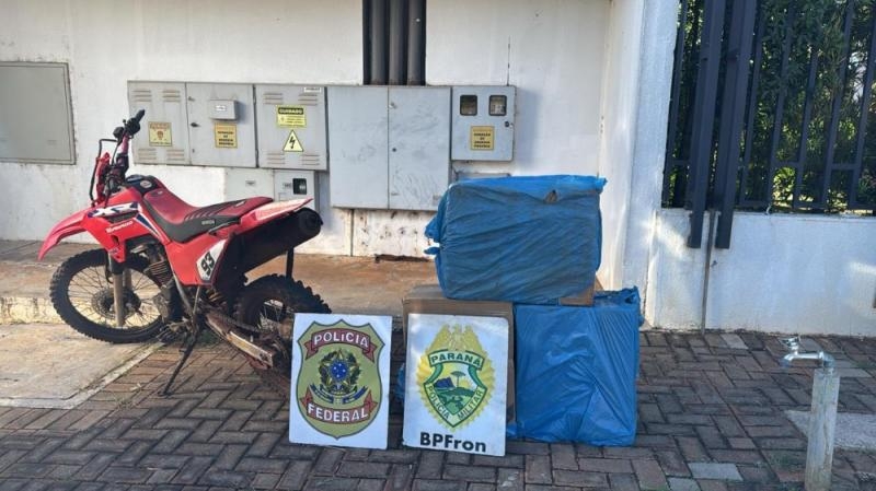 Uma motocicleta utilizada para o transporte de produtos ilícitos foi apreendida nesta terça-feira (25), próximo ao Lago de Itaipu, em Guaíra, após uma tentativa de fuga por uma plantação. O veículo foi interceptado por uma força-tarefa de segurança e transportava cigarros de origem paraguaia.