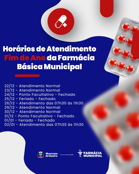 O Município de Guaíra, por meio da Secretaria Municipal de Saúde, informa à população os horários de funcionamento da Farmácia Básica Municipal durante o período de fim de ano.