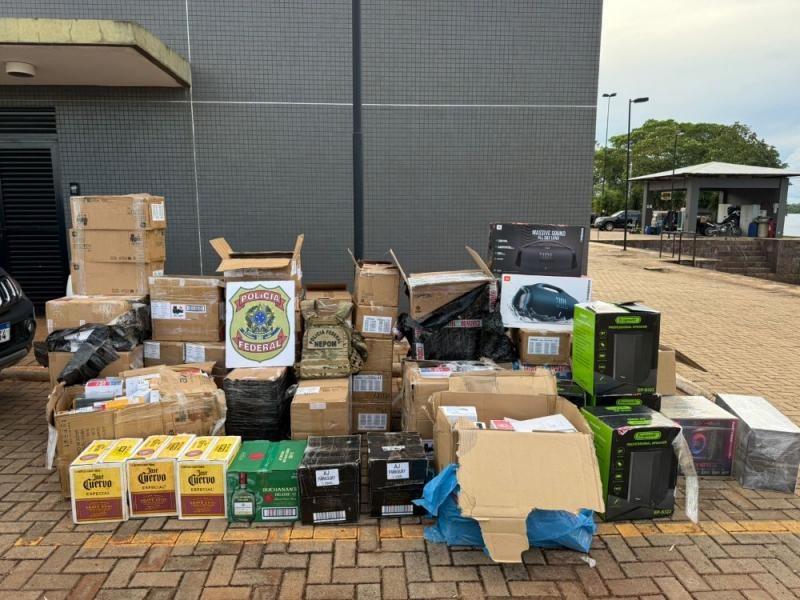 Durante as diligências, os agentes localizaram os produtos em uma residência utilizada como ponto de armazenamento. No local, foram encontrados oito volumes de caixas de som, seis volumes de bebidas alcoólicas, 21 volumes de dispositivos eletrônicos do tipo “pods” e outros 19 volumes contendo eletrônicos diversos e aparelhos celulares. O automóvel empregado no transporte do material também foi apreendido.