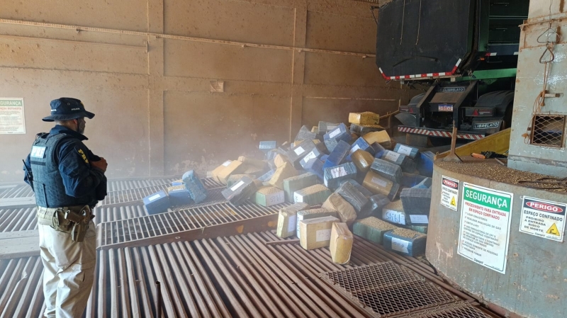 Ao realizarem uma vistoria minuciosa no compartimento de carga, a equipe localizou diversos fardos de maconha ocultos sob a soja.