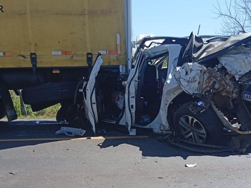Conforme testemunhas, uma carreta estava parada em trecho de “pare e siga”. Atrás estavam a picape Fiat Toro e o Gol. Desgovernada, outra carreta que seguia no mesmo sentido bateu nos dois carros. O Gol foi jogado para fora da pista e a Toro parou embaixo da carreta da frente.
