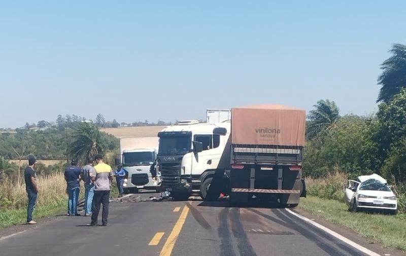 Um grave acidente entre duas carretas e dois veículos de passeio deixou duas pessoas feridas e uma mulher morta, na manhã desta terça-feira (21), na altura do km 164 da BR-163, entre Naviraí e Juti, região sul de Mato Grosso do Sul.