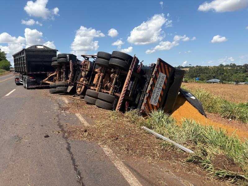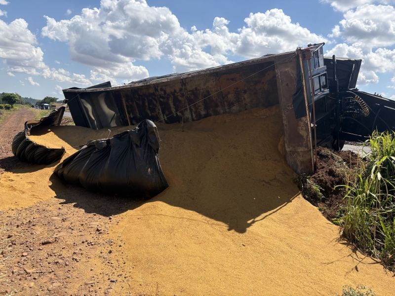 Não houve feridos no sinistro e a carga de farelo de milho ficou espalhada em uma estrada rural as margens da BR-163.
