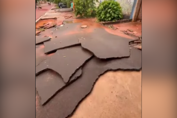 O asfalto saiu da rua Pedro Segura Alda, que fica na região central da cidade. Nos trechos que não ficaram completamente em terra, restaram pedaços da estrutura.