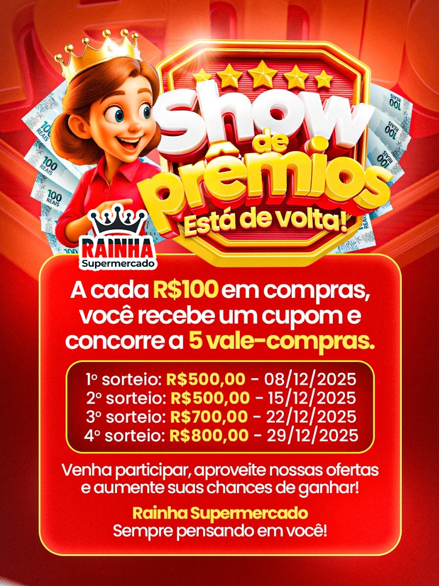 Além das ofertas imperdíveis em todos os setores do supermercado, a Super Queima do Carrinho Cheio marca também o início da campanha ‘Show de Prêmios”, que sorteará 5 vale-compras.
