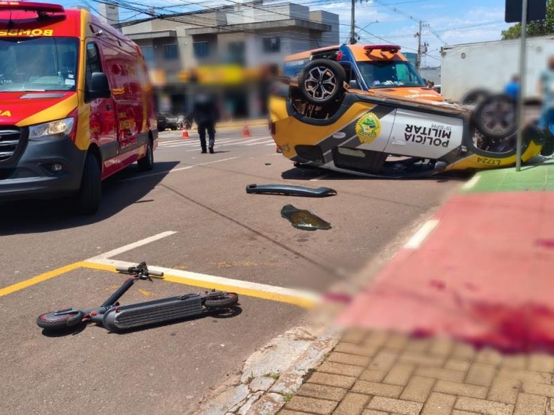 Um grave acidente foi registrado por volta das 11h40 desta sexta-feira (24), no cruzamento das ruas Piratini e Rui Barbosa, na região central de Toledo. A colisão envolveu uma viatura da Polícia Militar (PM), um patinete elétrico e um furgão Ford F-4000.