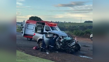 Pai e filha ficam encarcerados em caminhonete após colisão frontal com ônibus na PR-493