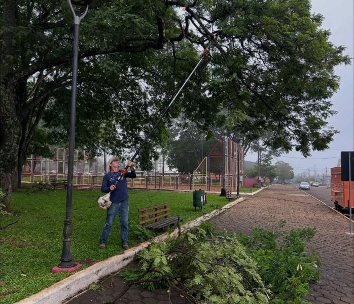 O serviço está concentrado, principalmente, na área central da cidade, com destaque para a região da Praça Willy Barth, onde ocorre a limpeza das vias, recolha de galhos, retirada de entulhos e corte de árvores que foram derrubadas pelos ventos.