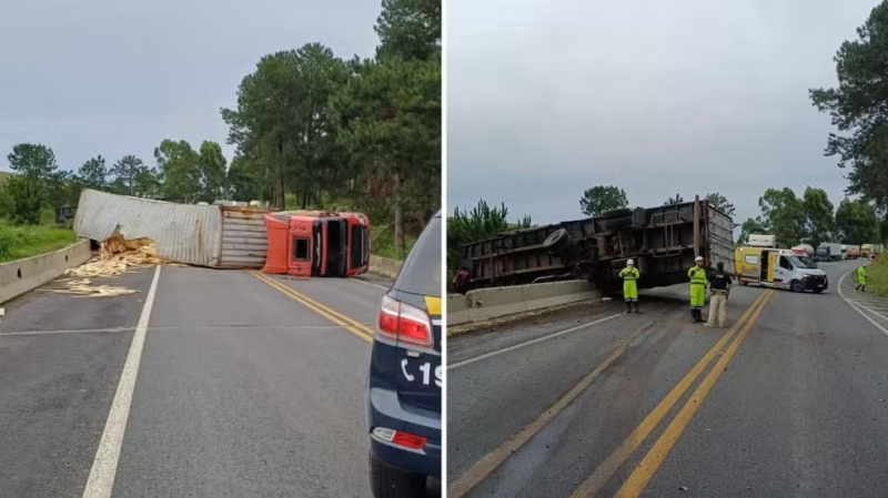 Um caminhão bitrem 9 eixos tombado está bloqueando a BR-277 na manhã desta terça-feira (16) na divisa entre Palmeira e Balsa Nova, nos Campos Gerais do Paraná.
