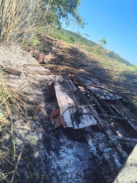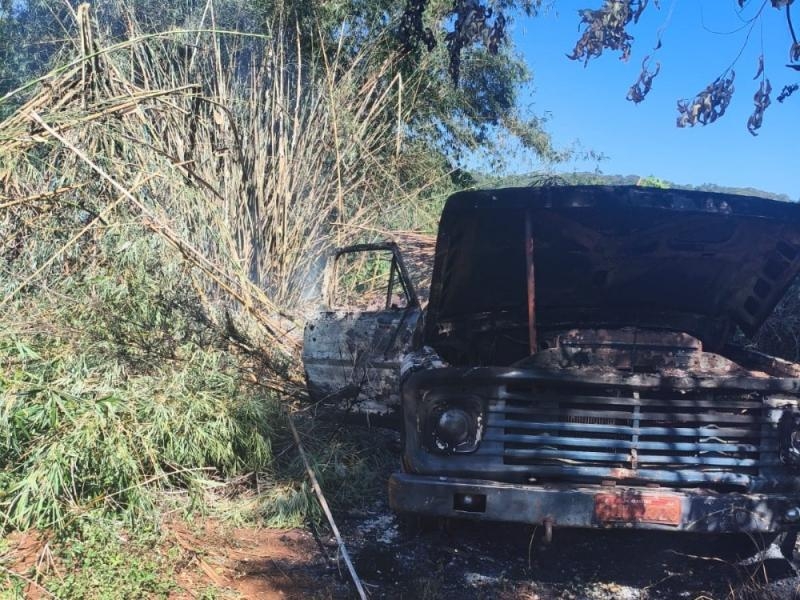 As chamas tomaram grandes proporções e destruíram por completo o veículo. O fogo também atingiu um bambuzal e um pulverizador agrícola, que também ficou parcialmente destruído.
