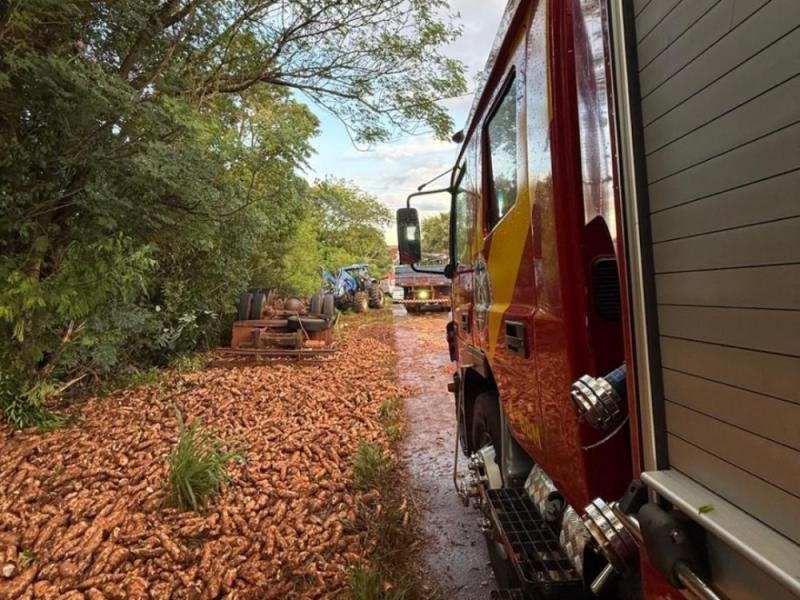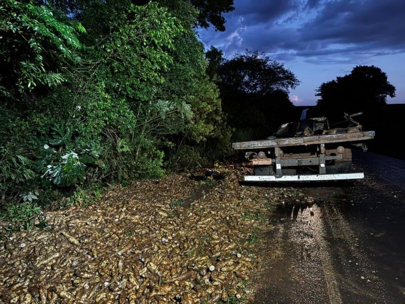 Um caminhão carregado com mandioca tombou na tarde de sexta-feira (06) na rodovia que liga o distrito de Alto Alegre a cidade de Terra Roxa. O acidente aconteceu durante chuva, em uma descida da via.