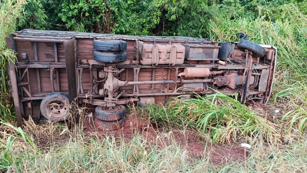 A movimentação repentina fez o condutor perder o controle da direção, levando o caminhão a sair da via e tombar na sequência.