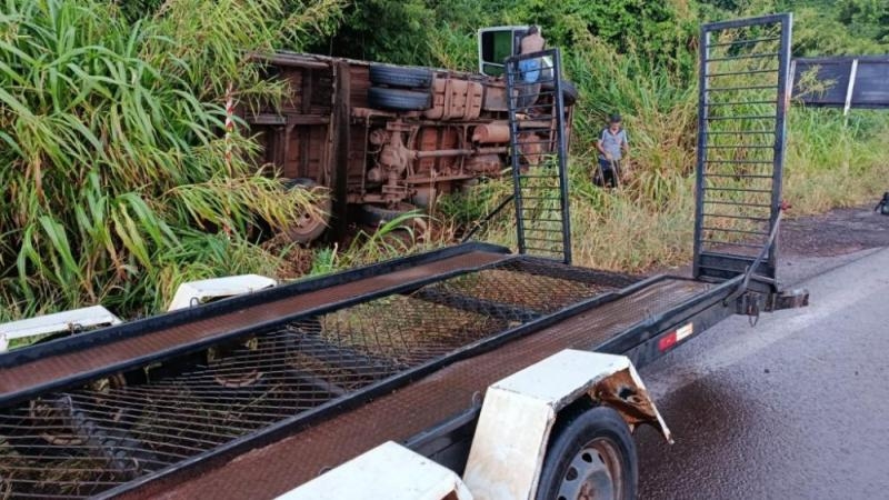 O veículo, um Ford Cargo com placas do Mercosul, trafegava vazio e rebocava uma carretinha no momento do sinistro.