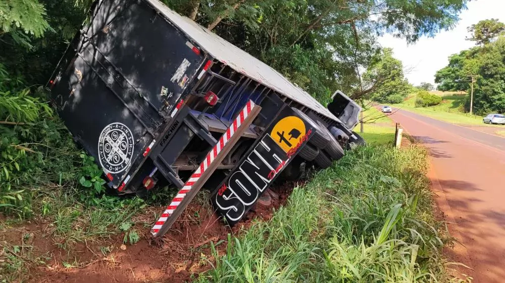 Um caminhão baú carregado com cerca de 13 toneladas de farinha de trigo tombou na tarde desta quinta-feira (29) à margem da rodovia PR-491, na saída de Nova Santa Rosa para Maripá, após o motorista realizar uma manobra brusca em uma decida para evitar uma colisão com uma colheitadeira, que estaria trafegando de ré na pista, sem batedor, colocando em risco a segurança viária no trecho.