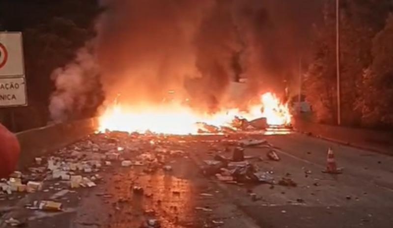 O bloqueio no trânsito inicia no km 662, em frente à PRF de Tijucas do Sul. Equipes da PRF, da concessionária Arteris Litoral Sul e do Corpo de Bombeiros estão atuando no local.