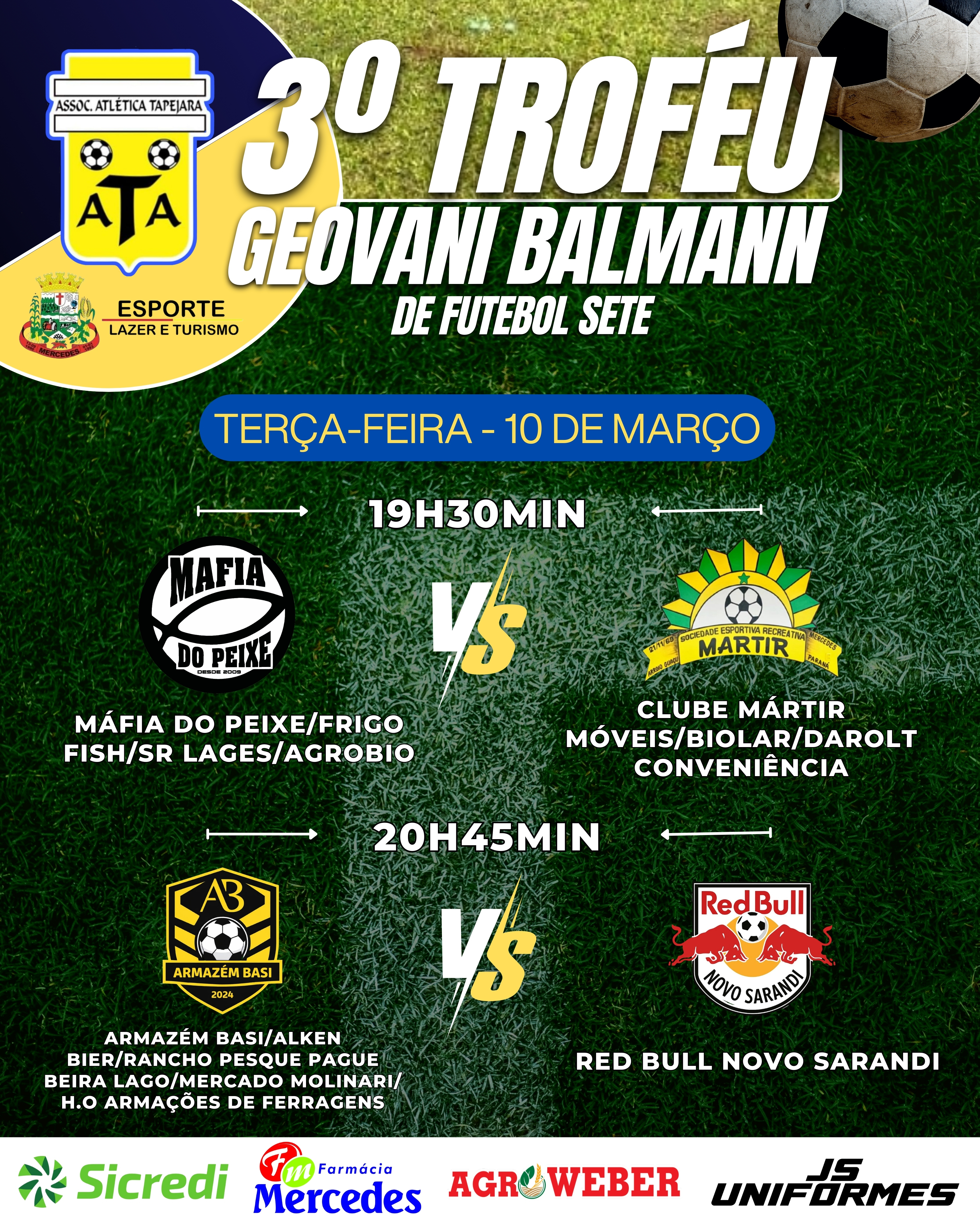 A programação da competição prevê jogos sempre nas noites de terça e quinta-feira, no campo da Associação Tapejara. A disputa leva o nome do Troféu Geovani Ballmann, reunindo equipes da região em mais uma edição do campeonato de futebol sete.