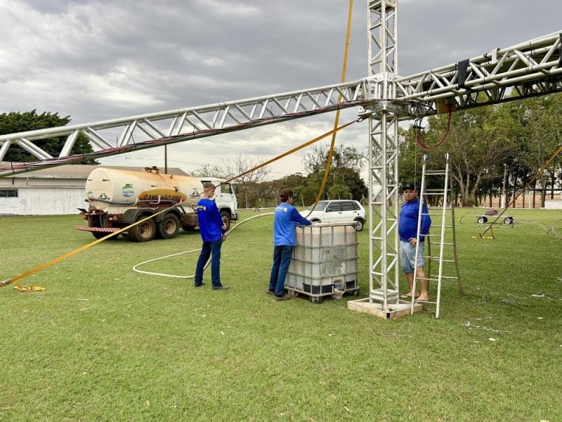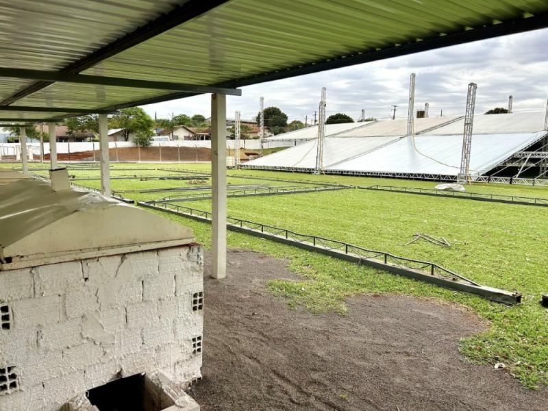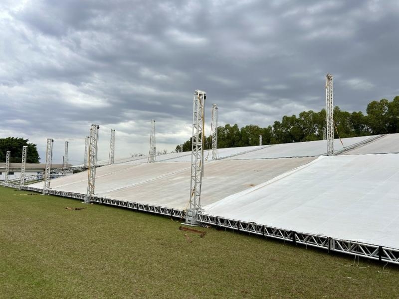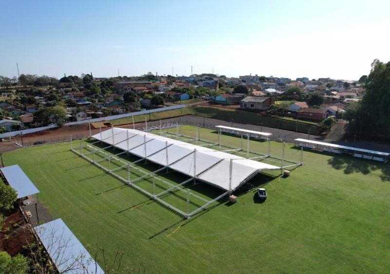 Os trabalhos desta semana estão concentrados na montagem do pavilhão central, espaço que vai receber os shows nacionais gratuitos e a tradicional Festa Nacional do Costelão Recheado.