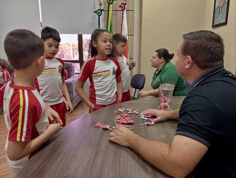 Alunos do 4º ano da Escola José de Alencar, de Três Irmãs, visitaram na manhã desta quarta-feira (15) o Gabinete do Prefeito Laerton Weber. A atividade integra o projeto “Conhecendo o Município”, que busca aproximar os estudantes da administração pública e mostrar, de forma prática, como funciona a Prefeitura.