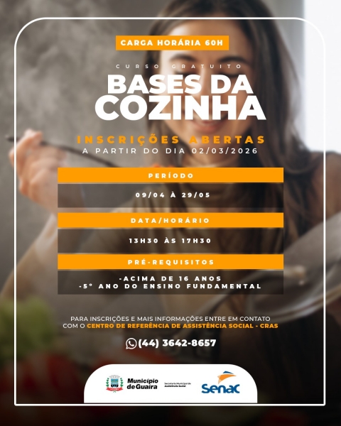 O Município de Guaíra amplia as oportunidades de qualificação profissional na área da alimentação. Por intermédio da Secretaria Municipal de Assistência Social, por meio do Centro de Referência de Assistência Social (CRAS), em parceria com o Serviço Nacional de Aprendizagem Comercial, oferta o curso gratuito “Bases da Cozinha”, com carga horária de 60 horas e 20 vagas disponíveis.