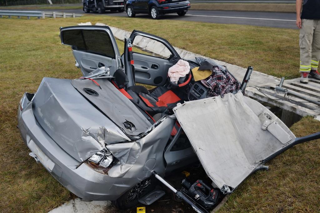A mulher, passageira do Clio, ficou enclausurada, e o carro precisou ser totalmente recortado para possibilitar a remoção da vítima em segurança.