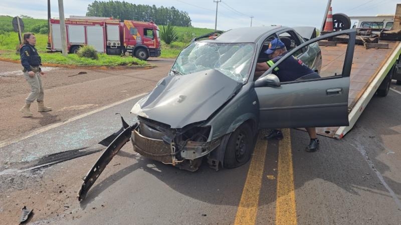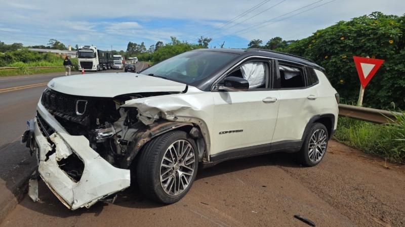 A forte colisão aconteceu no trevo de Novo Horizonte, envolvendo um GM/Classic e um Jeep/Compass, deixando três feridos.