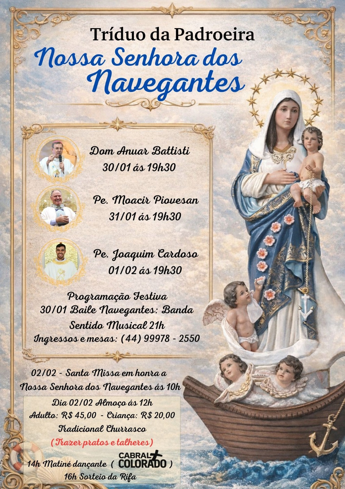 A Paróquia Nossa Senhora dos Navegantes, em Guaíra, realiza entre os dias 30 de janeiro e 2 de fevereiro o Tríduo da Padroeira Nossa Senhora dos Navegantes, com uma programação que reúne celebrações religiosas e atividades festivas abertas à comunidade.