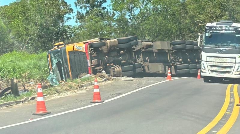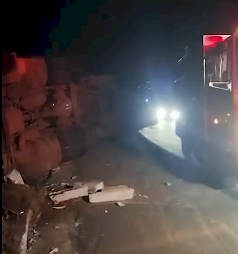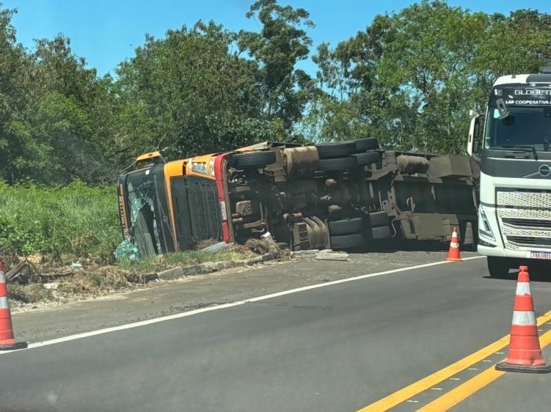 Conforme as informações, a carreta Volvo seguia pela BR-163 do Mato Grosso Sul ao Paraná e, ao chegar na curva, acabou tombando as margens da rodovia.