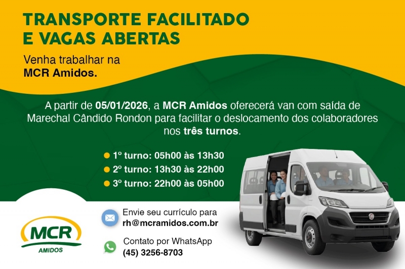 A MCR Amidos de Mercedes informa que, a partir do dia 05/01/2026, passará a disponibilizar transporte com van, com saída de Marechal Cândido Rondon e destino até a empresa, com o objetivo de facilitar o deslocamento dos colaboradores e atender à rotina de trabalho por turnos.