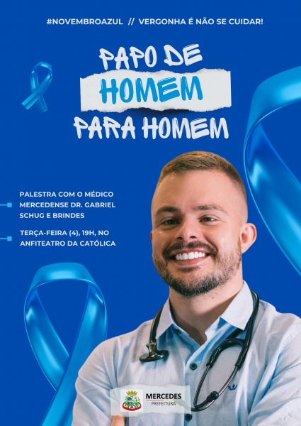 Em alusão ao Novembro Azul, mês voltado à conscientização sobre a saúde do homem, a Secretaria de Saúde de Mercedes realiza nesta terça-feira (05), às 19h, no anfiteatro da Católica, a palestra “Papo de Homem para Homem”, conduzida pelo médico mercedense Dr. Gabriel Schug.