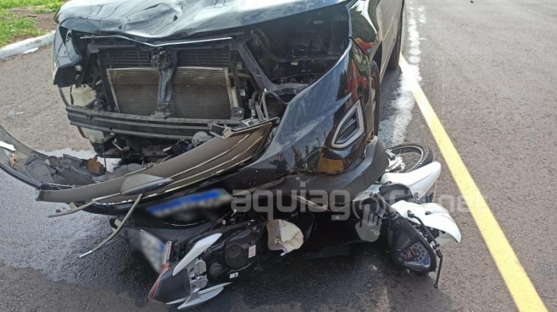 A moto ficou presa embaixo do veículo e segundo a Polícia Militar, foi arrastada por 22 metros após a colisão.