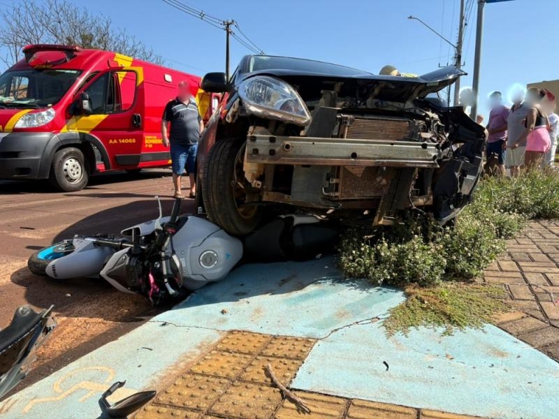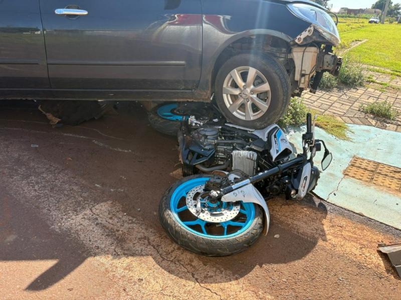 Uma forte colisão deixou um motociclista ferido na manhã deste sábado (07), no centro de Marechal Rondon. A moto ficou presa embaixo do veículo após a batida, que ocorreu próximo à Rodoviária.