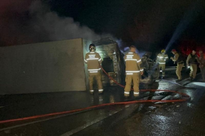 Equipes do Corpo de Bombeiros atuaram no combate às chamas e no resgate, com apoio da concessionária responsável pelo trecho e da Polícia Rodoviária Estadual e Militar.