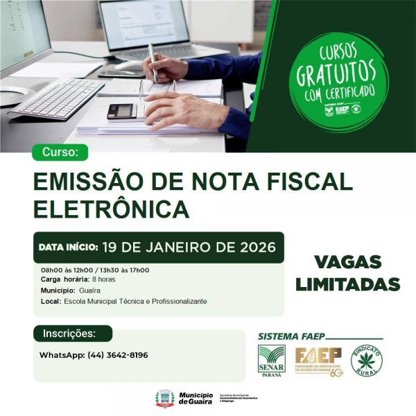 O Município de Guaíra divulga a realização do curso gratuito Emissão de Nota Fiscal Eletrônica, voltado à capacitação de pessoas interessadas em aprimorar conhecimentos na área administrativa e fiscal.